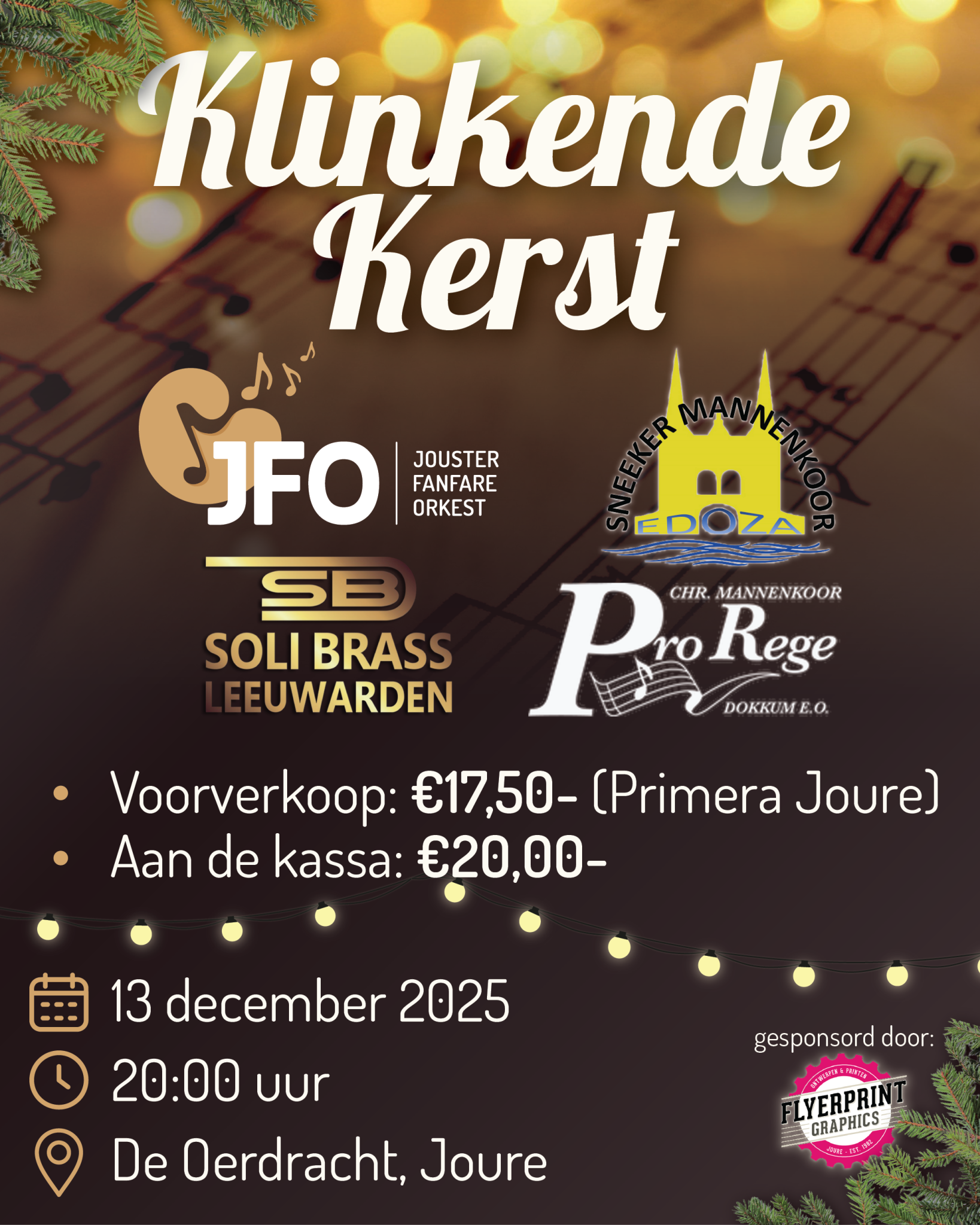 De dagen worden weer korter. Dat betekent dat het weer tijd is voor gezellige kerstsferen en warme klanken! Deze kerst zullen de schitterende koper- en koorklanken te horen zijn van het JFO, Soli Brass, Edoza en Pro Rege.